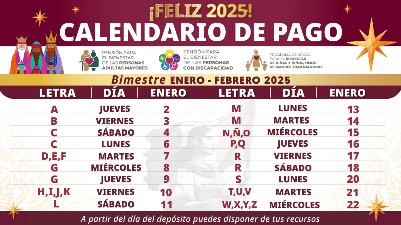 La secretaria compartió el calendario de la dispersión de pagos del primer bimestre de 2025, la cual finaliza el miércoles 22 de enero y se encuentra organizado por la inicial del primer apellido: