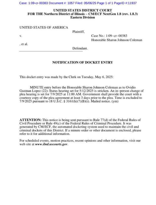 Ovidio Guzmán, hijo del narcotraficante Joaquín El Chapo Guzmán, se declarará culpable de diversos cargos de narcotráfico ante una jueza federal de Chicago, en una audiencia programada para el 9 de julio, tras llegar a un acuerdo con fiscales de los Estados Unidos; publica MILENIO.