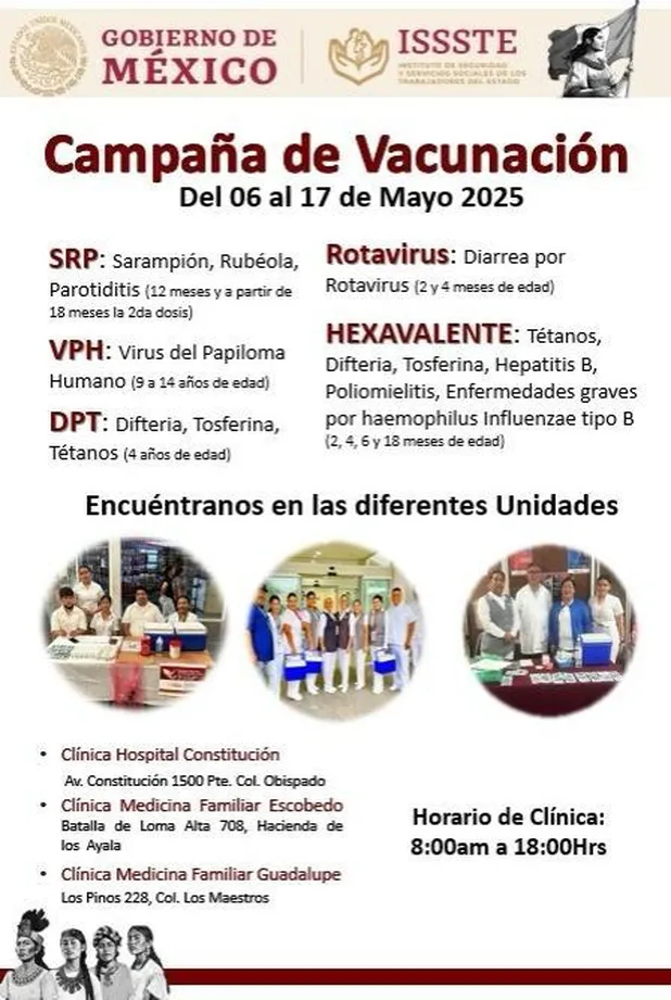 «Está dirigida a la población, especialmente niños. Contamos con la Clínica de Medicina Familiar de Escobedo, la Clínica de Medicina Familiar de Guadalupe, así como la clínica Hospital Constitución, con un horario de 8:30 a 18 horas. Las vacunas son gratuitas y estaremos para aplicar a todo el público en general, aunque no sean derechohabientes del ISSSTE. Solo deben llevar su cartilla de vacunación.»