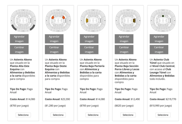 También hay secciones VIP, como en la zona Asiente Club Túnel, situada en el Nivel Club Central con acceso al Lounge Túnel el costo anual sería de 219 mil 770 pesos, es decir 10 mil 990 por encuentro; Asiento Club Oeste Central en el Nivel Club el costo es de 136 mil 280 pesos, 6 mil 810 por partido.