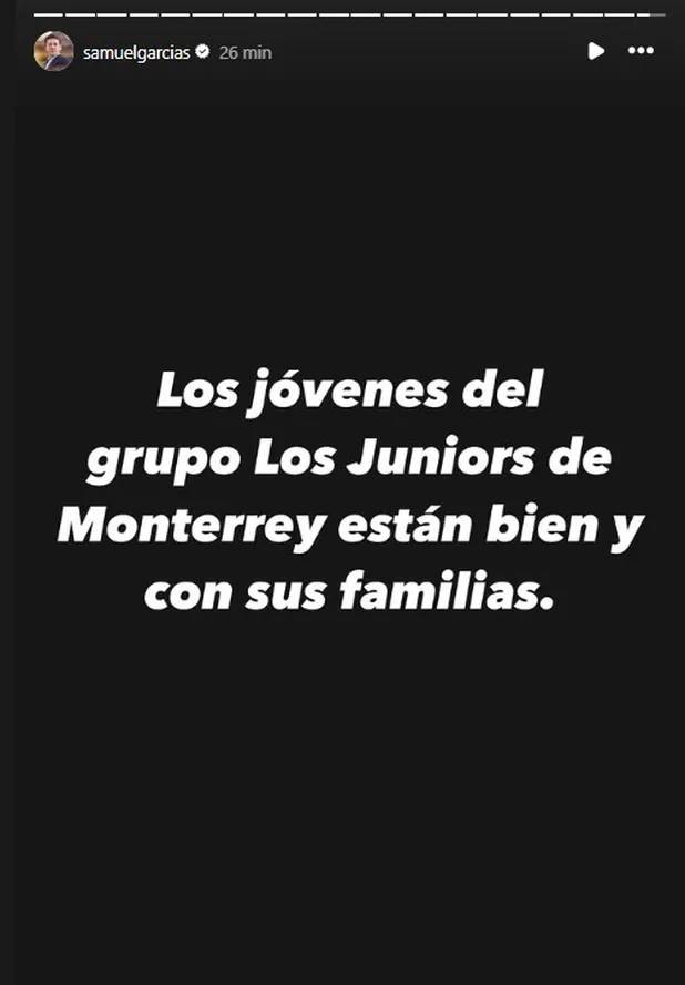 «Aprovecho este inter para informar sobre la noticia que dice el gobernador Samuel García, que los jóvenes del grupo musical Los Juniors de Monterrey están bien y con sus familias», dijo la secretaria de Gobernación.