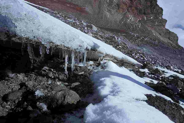 El mayor de los montañistas recuerda que en 1970 no llovía a más de 4 mil metros y ahora caen aguaceros que alcanzan los 5 mil 600 metros, en la cumbre, lo cual además de lavar la nieve, está causando erosión y cambios morfológicos en la montaña más alta de México. Aparece a lo lejos la pared rocosa que muestra las filtraciones del glaciar, que caen a una superficie arenosa y se filtran hasta volver a aparecer muy abajo, a 3 mil metros, en la Barranca de Jamapa, donde se considera inicia el río Jamapa.