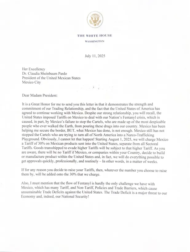 A través de una carta enviada por el presidente estadunidense, Donald Trump, a su homóloga de México, Claudia Sheinbaum, señala que, a pesar de la sólida relación entre ambos países y combatir el narcotráfico y otras problemáticas, no ha sido suficiente.