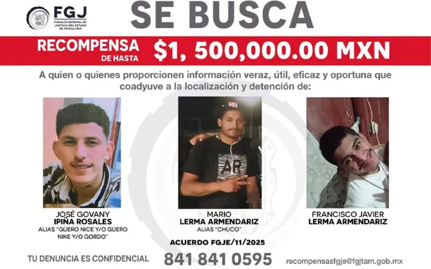 La Fiscalía General de Justicia del Estado de Tamaulipas anunció una recompensa de hasta un millón y medio de pesos a quien proporcione información verídica y útil que conduzca a la captura de tres presuntos implicados en el asesinato de los cinco integrantes del grupo musical Fugitivo, crimen ocurrido en Reynosa el pasado 25 de mayo.