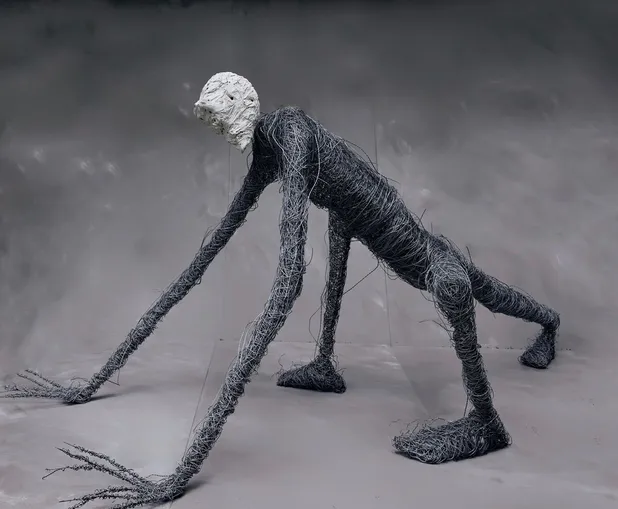 La muestra, compuesta por piezas construidas con alambre, textiles quirúrgicos, fuego y estructuras que evocan cuerpos sin piel, encarna una presencia inquietante, ambigua y profundamente sensorial.