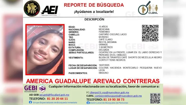 La autoridad también busca a América Guadalupe Arévalo Contreras, de tan solo 15 años de edad, la cual desapareció el pasado 19 de julio en la colonia Hacienda Montecarlo, en el municipio de Pesquería.
