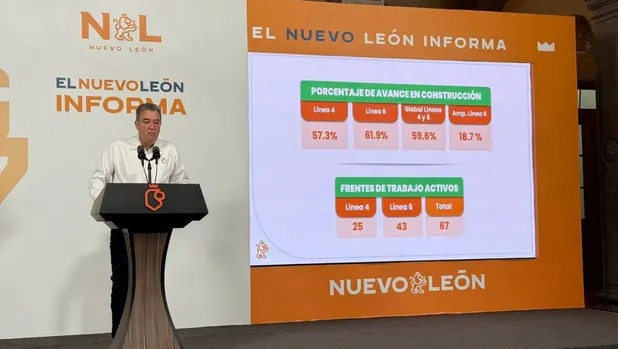 Actualmente, la línea 4 del Metro tiene un avance del 57.3 por ciento, la línea 6 un 61.9 por ciento y la ampliación del centro de Apodaca al aeropuerto tiene apenas un 18.7 por ciento.