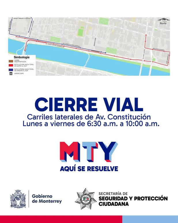 La Secretaría de Seguridad y Protección Ciudadana de Monterrey, a través de la Dirección de Tránsito y Vialidad, estarán implementando el cierre.