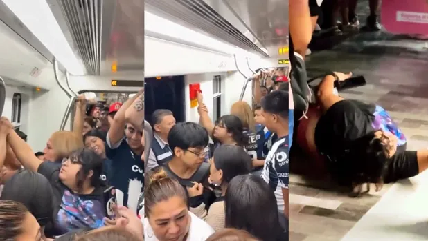 Los guardias de Metrorrey se aproximaron a la puerta, sin embargo, fueron unas aficionadas quienes la sacaron a empujones del vagón, generando risas entre los presentes.
