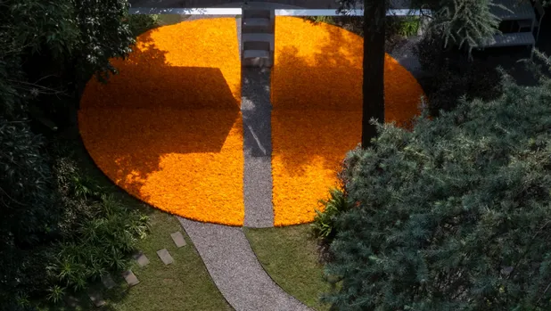 “Con volúmenes en positivo (mundo de los vivos) y negativo (mundo de los muertos). Está dividido en dos partes: la primera es una montaña de flores de cempasúchil, relacionado con el mundo de los vivos; después subiremos a una estructura circular, que en el centro habrá un cono invertido que llega al piso (mundo de los muertos). En esta parte, la gente tomará un objeto y lo depositará en esta estructura para replicar lo que nos pasará a todos eventualmente, que es morirnos”.