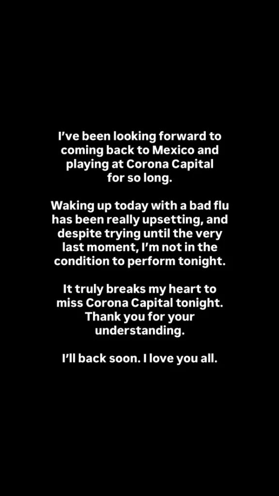Primero, escribió que tenía un gran anhelo de presentarse en el evento que se lleva a cabo en el Autódromo Hermanos Rodríguez: «Llevaba  muchísimo tiempo deseando volver a México y tocar en Corona Capital«.