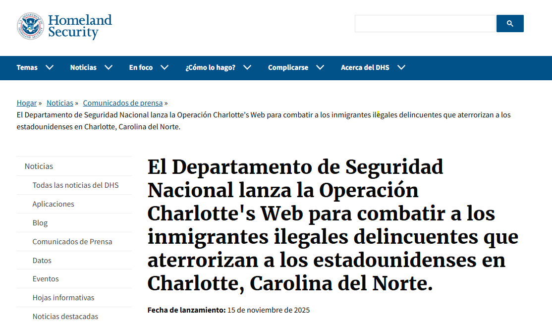 El operativo “Telaraña de Charlotte” (Charlotte’s Web), desplegado desde el pasado 15 de noviembre por la Patrulla Fronteriza en Charlotte, Carolina del Norte, concluyó este 20 de noviembre con más de 200 personas detenidas, informaron autoridades locales; publica SPR.