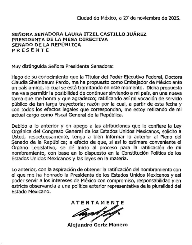 En el oficio enviado a Laura Itzel Castillo, presidenta de la Mesa Directiva de ese órgano, Gertz Manero no hizo referencia a ninguna renuncia, solo oficializó su salida de la fiscalía, cargo para el que fue elegido en enero de 2019 por nueve años.