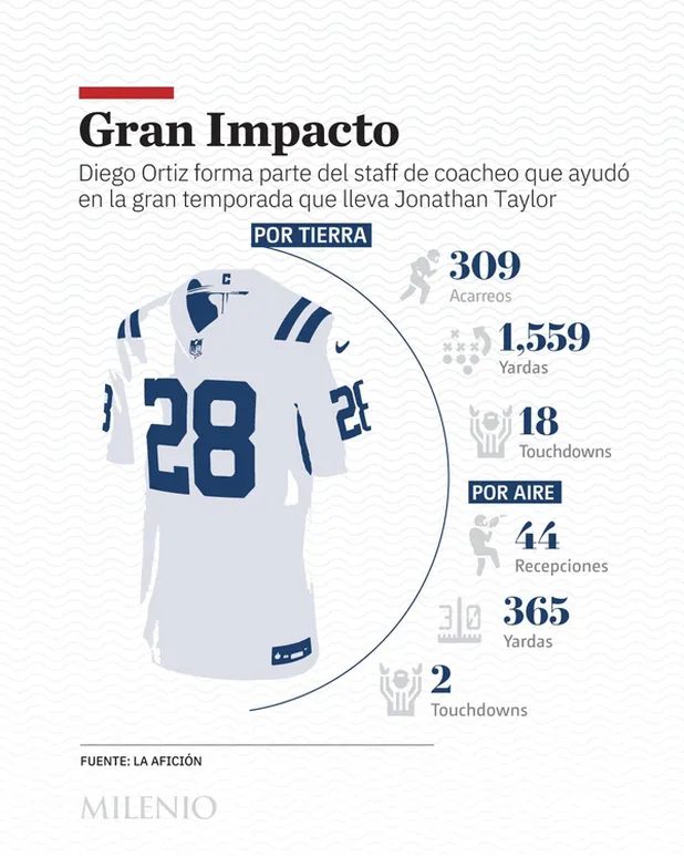 Diego Ortiz vive el sueño que muchos tienen en la NFL. Es el primer coach nacido en México en llegar a un equipo de la Liga más importante y rica del mundo, y vive su segundo año en un proyecto que es muy querido en su país: los Indianapolis Colts. Esos Colts que enamoraron a miles de aficionados con el brazo de Peyton Manning y que hoy son acreedores de aplausos por medio de las piernas de Jonathan Taylor, con quien Diego trabaja de forma directa y que hoy ha sido clave para que el corredor tenga una de sus mejores temporadas, posicionándose como un aspirante serio al Jugador Ofensivo del Año; publica MILENIO.