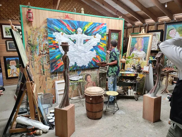 El visitante que entra al estudio de Lind siente, más que observar, una energía que envuelve. A veces hay música de bomba en el fondo; otras, sólo el sonido de los gallos que entran y salen, o del viento que refresca un poco el ambiente. El artista, de barba gris y mirada serena, suele recibir a los turistas sin protocolo. Habla despacio pero con una alegría que contagia. No tiene prisa: su obra, dice, pertenece al tiempo de la naturaleza, no al de la ciudad.