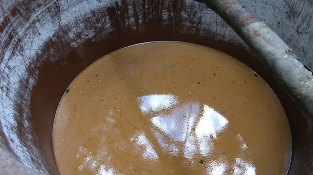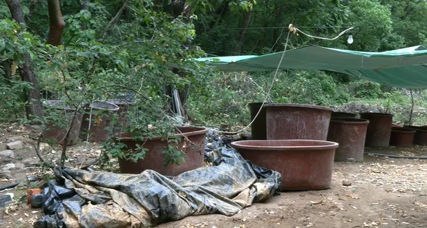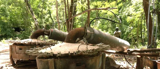 Armatostes de aluminio y tubos improvisados conforman un sistema de destilación rudimentario. El reactor, de fabricación artesanal, parece todavía respirar, con una nata que sigue fermentando. Un estanque de agua turbia completa la escena. La superficie está cubierta por una película aceitosa: líquido usado para enfriar los reactores, que se filtra en el suelo y arrastra residuos hacia un riachuelo.