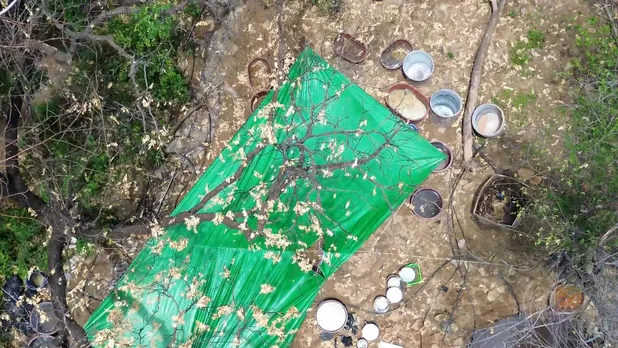 En los laboratorios clandestinos a los que se acudió para este reportaje, pero también en otros visitados a lo largo de más de cinco años de cobertura periodística, se ha podido observar una costra de cristales diminutos en el suelo, que brilla como si alguien hubiera esparcido diamantina. Sólo ramas secas, follaje marchito. Las hojas están chamuscadas. No es sequía. No es plaga. Es intoxicación química.