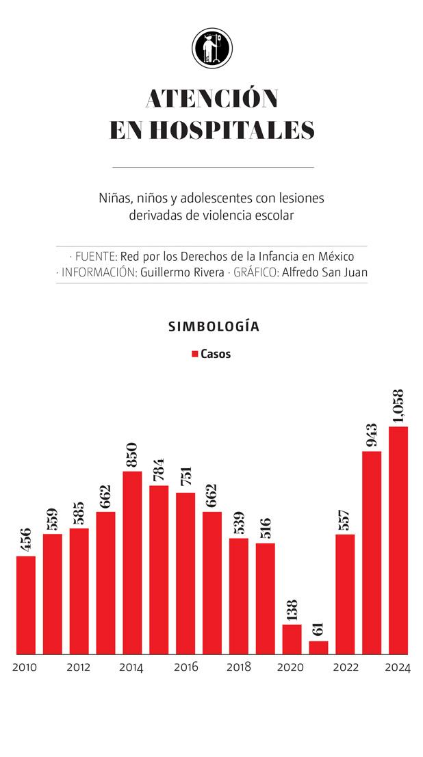 Entre 2022 y 2024, las hospitalizaciones de niñas, niños y adolescentes por violencia física ocurrida dentro de escuelas pasaron de solo 61 a mil 58 casos: un incremento de más de mil 600 por ciento, de acuerdo con información de la Red por los Derechos de la Infancia en México (Redim), elaborada con base en cifras oficiales del sector salud.