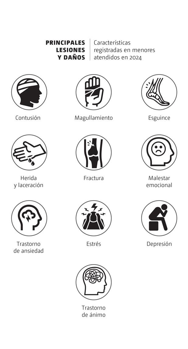 Tan sólo en 2024, más de la mitad de las víctimas presentó contusiones o magullamientos, mientras que una proporción significativa desarrolló malestar emocional, heridas abiertas, laceraciones, esguinces, fracturas y trastornos psicológicos como ansiedad, estrés postraumático, depresión y alteraciones del estado de ánimo.
