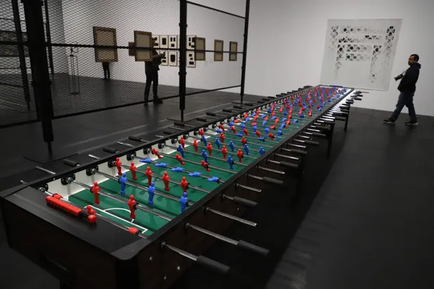 La instalación Juego de Niños #19: Haram Football, de Francis Alÿs, conmueve por mostrar una realidad tan actual, a pesar de que data de 2017. Aparecen niños jugando con una pelota imaginaria porque en Iraq está prohibido el futbol. Meten goles y forman la barrera frente a la portería para evitar un tiro directo. Se detienen ante el paso de los tanques de guerra, escuchan balazos que los obligan a correr para esconderse y salvar su vida.