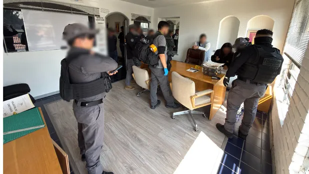 Durante la operación se aseguraron servidores, equipos de cómputo, teléfonos celulares, chips telefónicos, dispositivos bancarios, armas de fuego, narcóticos y documentación diversa.