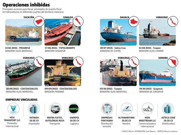 Además, de la naviera Altamira SA de CV, Ikon Midstream LLC y Azteca Cone SA de CV, así como una empresa fantasma de distribución terrestre y refacturación.
